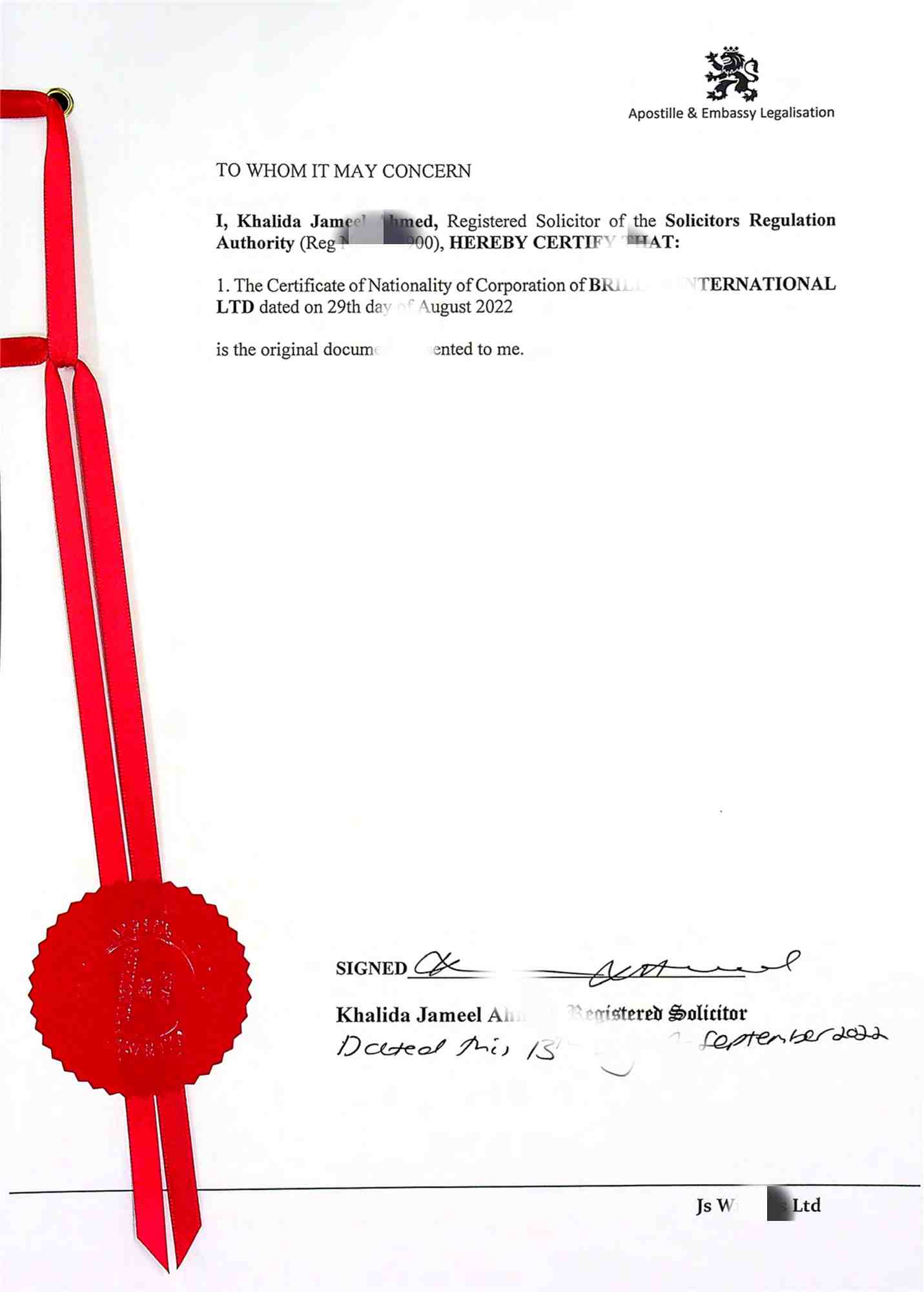 對于公司給代理律師出具的委托書,也需要把原件快遞給英國公證人,然后英國公證人進行公證,外交部認(rèn)證,最后是中駐英國使領(lǐng)館認(rèn)證。需要注意的是,委托書里面一定要寫清楚授托書所有信息,證件號及律師執(zhí)照號,以防法院在受理案件中,不能認(rèn)定代理律師是委托書內(nèi)的受托人。