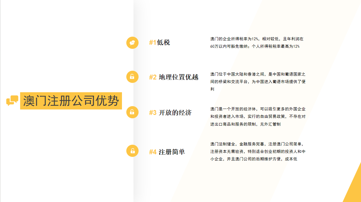 1.低稅 :澳門的企業(yè)所得稅率為12%,相對較低,且年利潤在60萬以內(nèi)可豁免繳納;個(gè)人所得稅稅率最高為12%