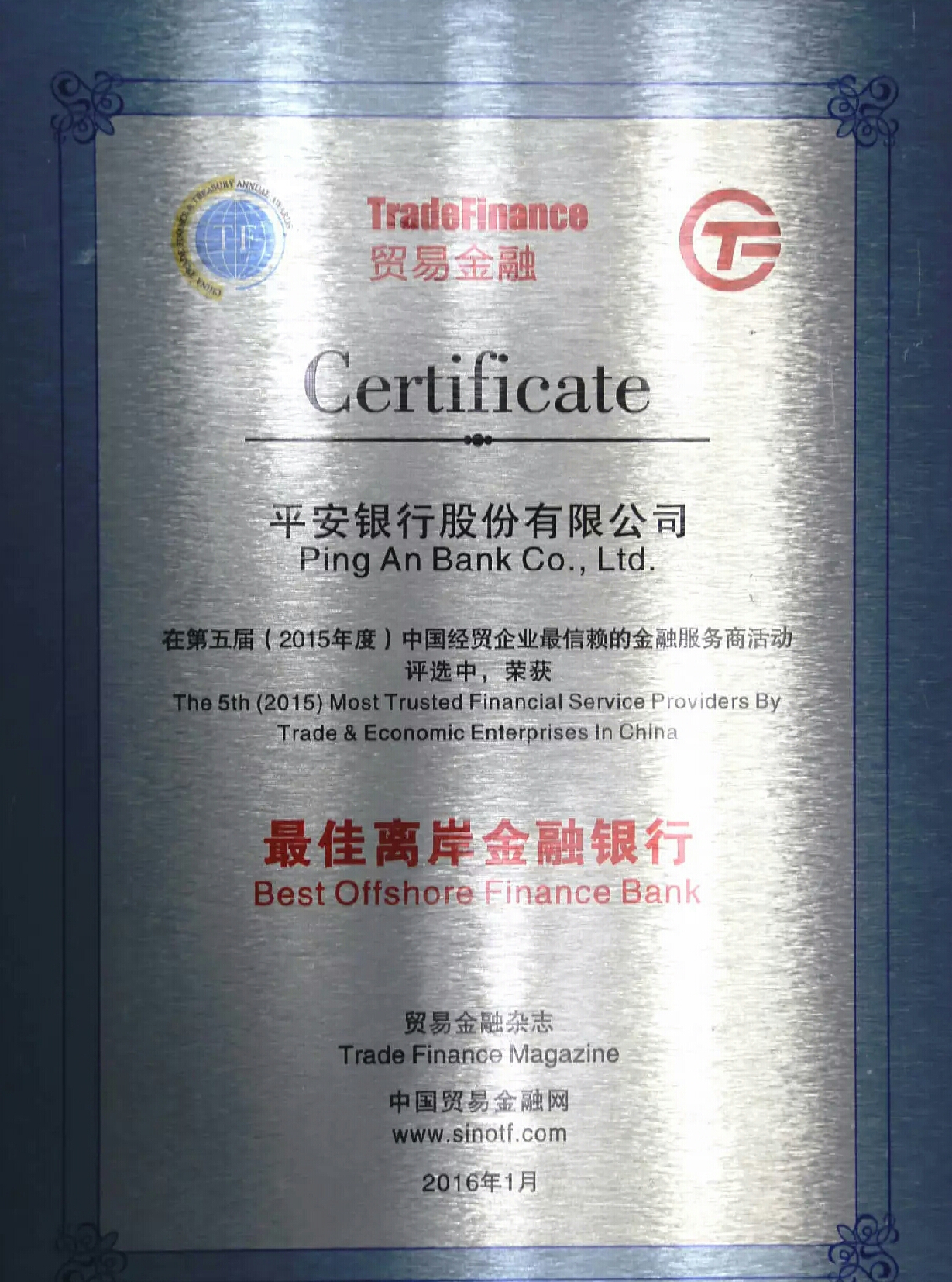 新年伊始,捷報頻傳。平安銀行憑借在離岸金融領域的優(yōu)異表現(xiàn),在不久前落下帷幕的《首席財務官》雜志舉辦的“第九屆中國CFO年會”和《貿(mào)易金融》雜志、中國貿(mào)易金融網(wǎng)聯(lián)合主辦的“第五屆中國經(jīng)貿(mào)企業(yè)最信賴的金融服務商評選”活動中,先后斬獲2015年度“最佳離岸業(yè)務獎”和“最佳離岸金融銀行”榮譽。這是平安銀行連續(xù)四年榮獲該兩項“最佳離岸銀行”獎項。