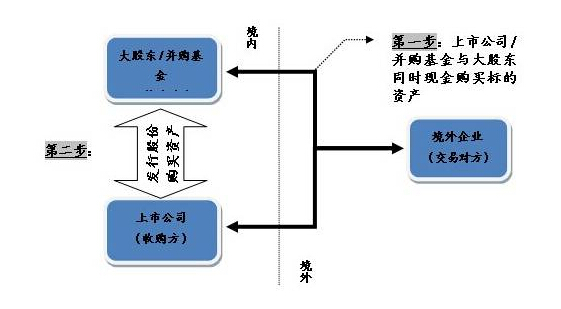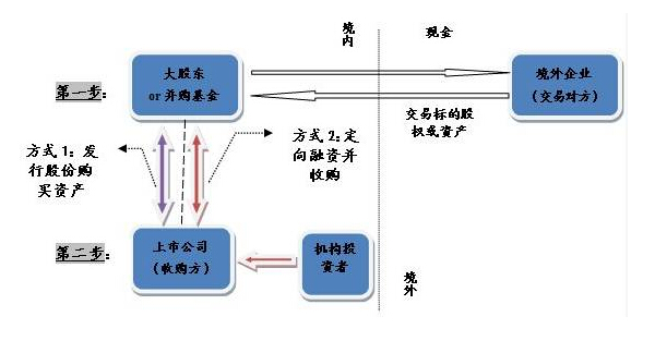 在上市公司境外并購中,由于境外出售方通常對于交易啟動到交割的時間要求較短,若采用上市公司直接收購境外標的的方式,可能會導致在時間方面無法滿足出售方的要求,因此,在不少的上市公司海外收購案例中,采用兩步走的方式,即:第一步,由大股東或并購基金收購境外資產(chǎn);第二步,再由上市公司通過發(fā)行股份購買資產(chǎn)或定增融資并收購的方式(見下圖方式1和方式2)將境外資產(chǎn)注入上市公司。具體交易結構如下: