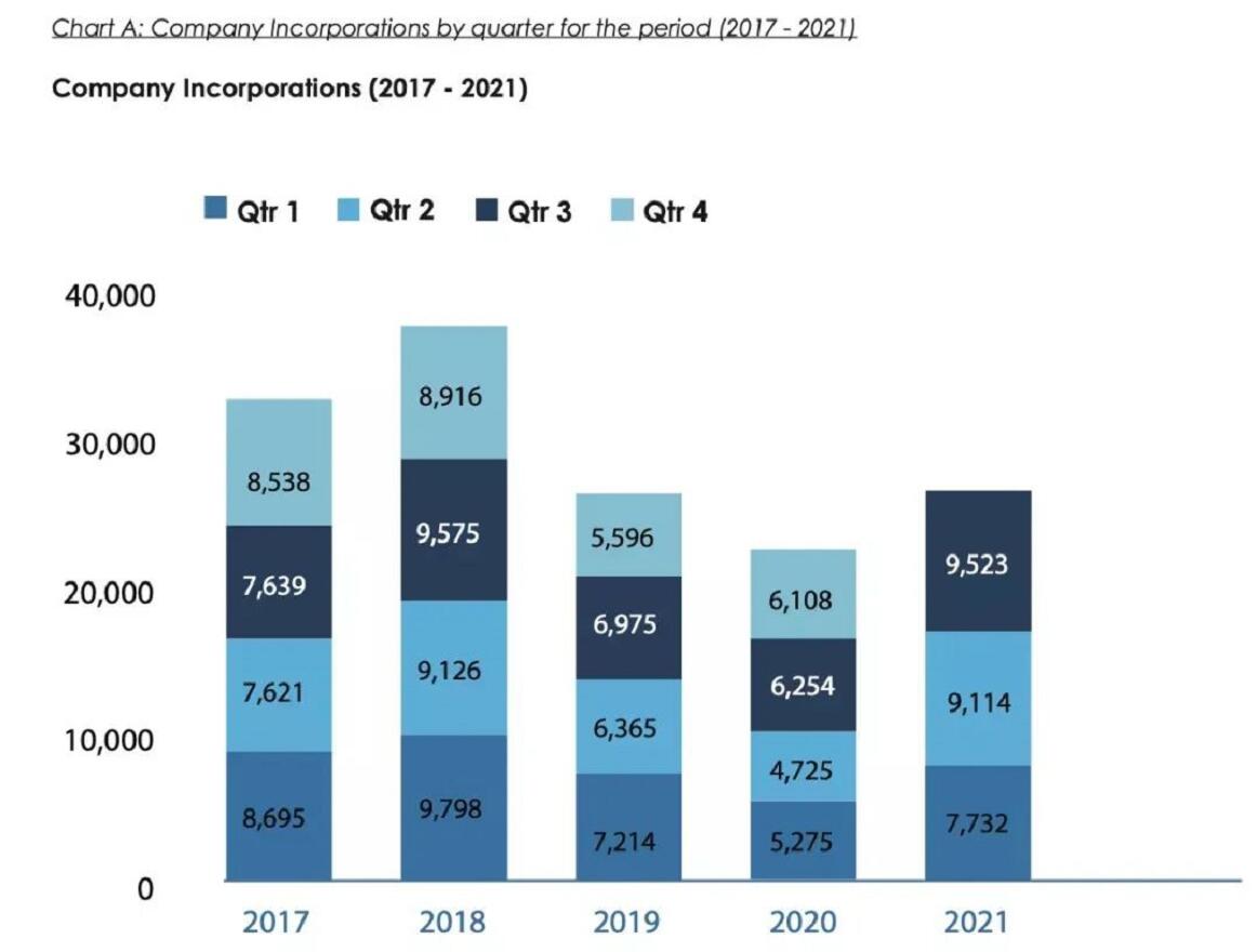 根據(jù)BVI公布的第三季度統(tǒng)計數(shù)據(jù),2021年前三季度的公司注冊數(shù)量為9523家,同比2020年第三季度的6254家增幅高達(dá)近35%;即便與今年第二季度的9114家相比,仍然保持了4.49%的增長態(tài)勢。