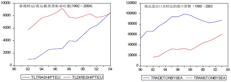 從下圖a可以發(fā)現(xiàn),自2001年開始,以廣州港和深圳港為主體的廣東沿海港口所處理的貨柜吞吐量(GDTEU)呈直線上升趨勢,增長速度快于香港港口的貨柜吞吐量(TOTLTEU)。對于港口貨運處理量(圖b),1998年始,以廣州港和深圳港為主體的廣東沿海港口處理的貨運量(GDTON)的增長速度就快于香港港口,到2000年已超過香港港口貨運處理量(TLTON)。因此,可以得出結論,自2001年始,經(jīng)香港港口轉運逐漸向內地港口直接付運發(fā)展。