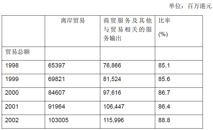 但由于香港1995年起開始采用詳細的服務貿(mào)易統(tǒng)計分類,1995年前沒有細分數(shù)字,為獲取更長序列的數(shù)據(jù),本文中離岸貿(mào)易數(shù)字采用“商貿(mào)服務及其他與貿(mào)易相關的服務”代替。本文也用1998—2002年的數(shù)字作比較,發(fā)現(xiàn)前者占后者的比例基本穩(wěn)定在85%—90%之間(見表1)。