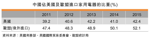 表:中國(guó)占美國(guó)及歐盟進(jìn)口家用電器的比重(%)