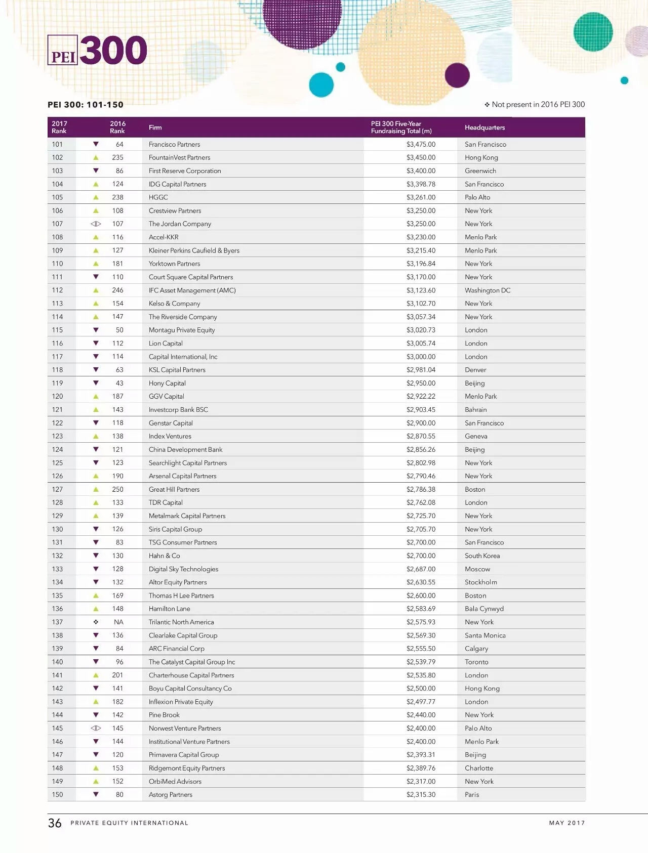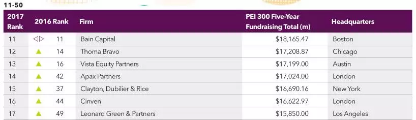 5月7日,倫敦最具權(quán)威的全球另類資產(chǎn)投資(私募股權(quán),債權(quán)投資,房地產(chǎn),etc.) 排名媒體Private Equity International發(fā)布了2016年最新的全球私募股權(quán)機(jī)構(gòu)排名。按照過去五年的融資額進(jìn)行排名,在各個(gè)機(jī)構(gòu)IRR并不透明的今天,融資額作為一個(gè)代表專業(yè)市場認(rèn)可度的指標(biāo),以五年為限,具有相當(dāng)?shù)墓哦取?這里主要提及在中國有業(yè)務(wù)的外資PE以及部分國內(nèi)本土的主流玩家,先看前十七名(將在大陸比較活躍的Silverlake包括進(jìn)來)。