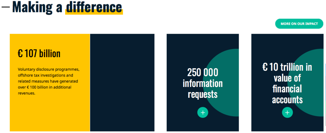 — 這一切指向的都是稅務(wù)透明,說白了也就是“征稅”。正如OECD所顯示的那樣,通過海量數(shù)據(jù)的賬戶信息交換,自動信息交換機(jī)制已經(jīng)為各國稅務(wù)部門創(chuàng)造出了上億歐元的稅收收入。通過離岸賬戶隱匿信息來避稅的傳統(tǒng)做法,再也無法行通了。