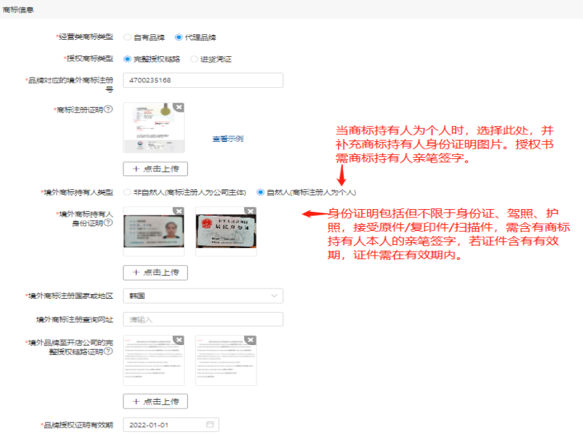 (1)選擇“代理品牌”,代理品牌類型選擇“完整授權(quán)鏈路”。并提供該商標的境外商標注冊證書或商標信息查詢截圖,以及商標持有人到開店公司的完整授權(quán)鏈路(5級以內(nèi))。當(dāng)商標為個人所有,商標持有人類型請選擇“自然人”,并同時上傳經(jīng)商標持有人簽字的持有人身份證明復(fù)印件/掃描件。