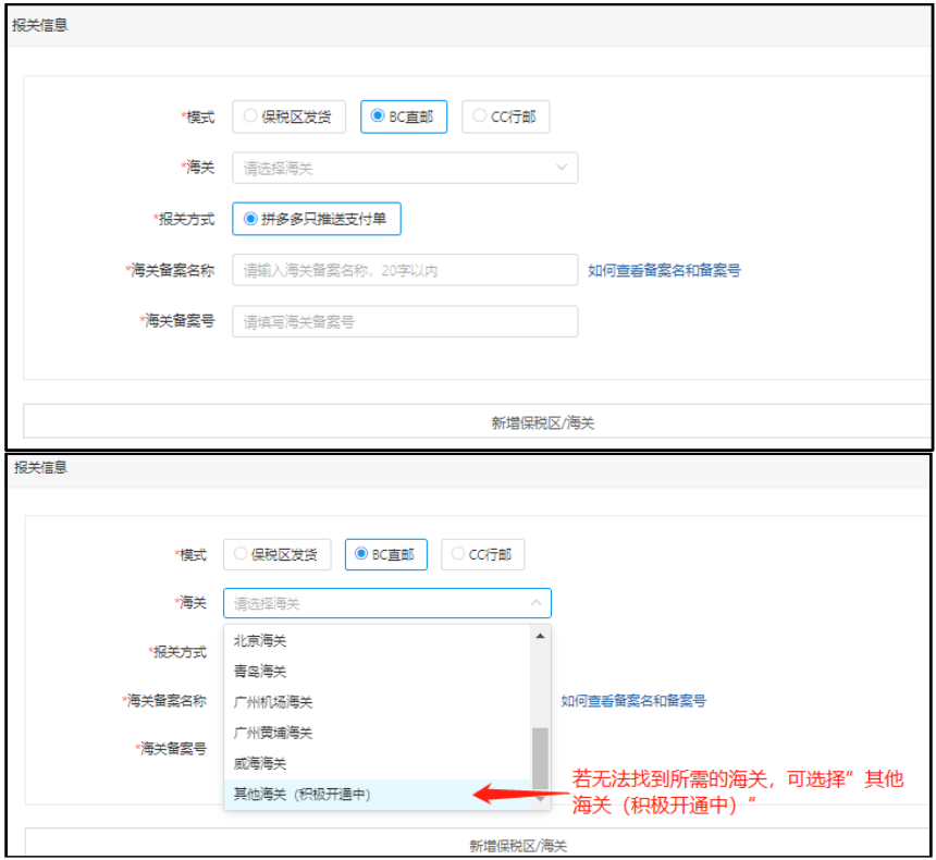 海關(guān)(積極開通中)”,并建議先與運營溝通核對具體海關(guān)的備案對接進度,反饋內(nèi)部評估推進。 當(dāng)選擇“CC行郵”時,無需填寫報關(guān)信息。