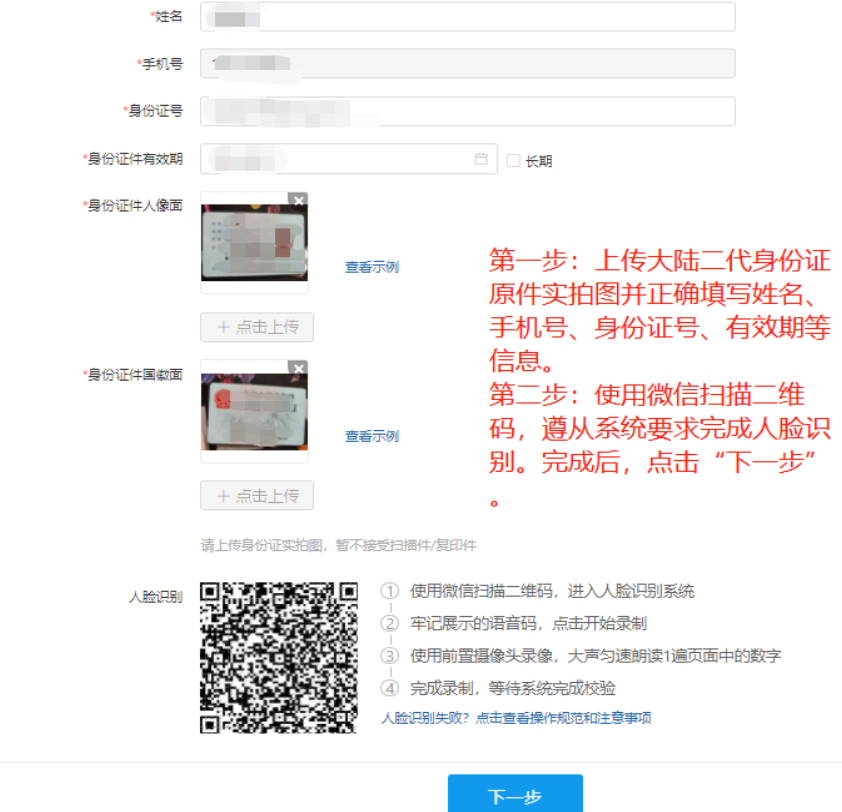 商家需在此處上傳店鋪管理人的中國大陸居民身份證圖片、填寫身份證信息,并使用微信掃描二維碼完成人臉識別。管理人身份證圖片暫時只接受中國大陸居民身份證原件實拍圖片。完成后,請點擊”下一步“。