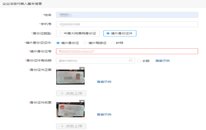 此處需上傳企業(yè)法定代表人的中國大陸居民身份證圖片、填寫企業(yè)法定代表人的手機號,并按照身份證圖片準確填寫姓名、身份證號、身份證件有效期。