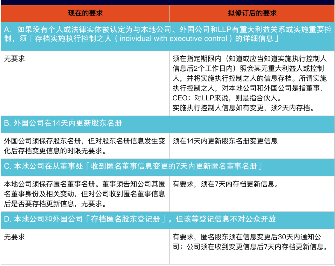 - 如果沒有個(gè)人或法律實(shí)體被認(rèn)定為與本地公司、外國(guó)公司和LLP有重大利益關(guān)系或?qū)嵤┲匾刂?,則要求本地公司、外國(guó)公司和LLP在“控制人登記冊(cè)”中「存檔實(shí)施執(zhí)行控制之人(individual with executive control)的詳細(xì)信息」;