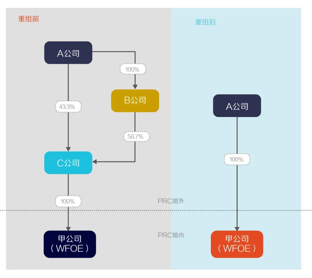 C公司是一家位于中國(guó)境內(nèi)的外商獨(dú)資企業(yè)甲公司(WFOE),原投資方為境外A公司和B公司,各自持有C公司股權(quán)比例分別為:43.3%和56.7%,且B公司由A公司100%控股。因境外集團(tuán)重組,B公司將其所持有的C公司56.7%股權(quán)轉(zhuǎn)讓給A公司,然后A公司吸收合并了C公司。吸收合并后,C公司不再存在,該境外吸收合并導(dǎo)致甲公司股東變更為A公司。