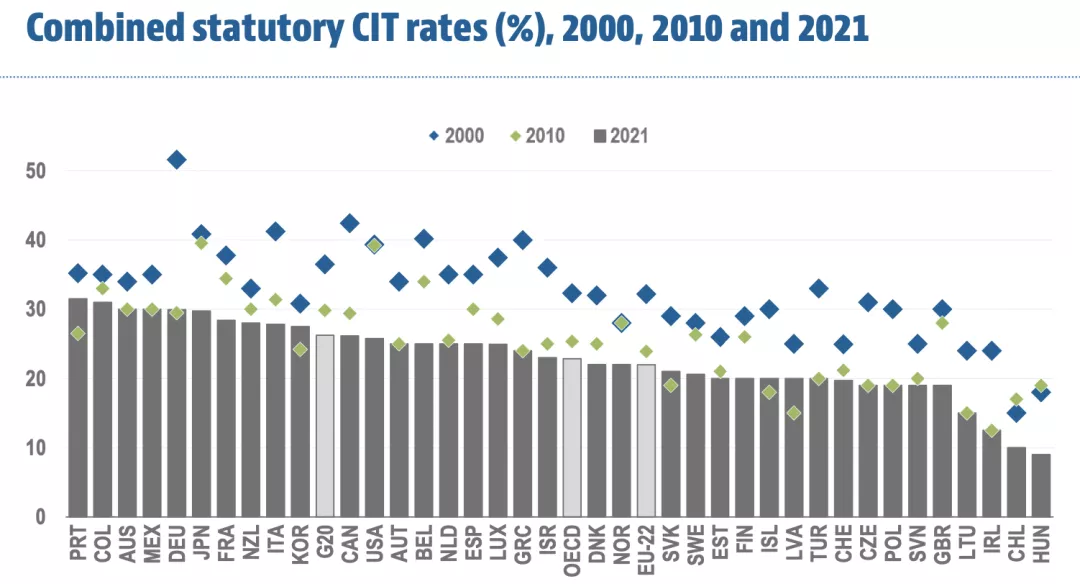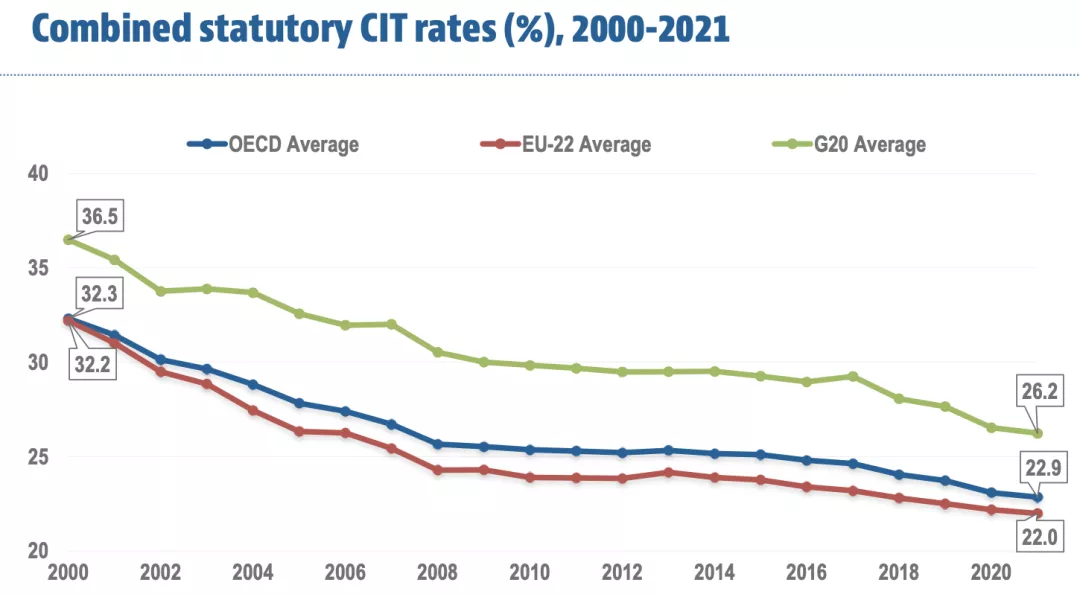 作為整體趨勢(shì),OECD成員平均CIT稅率、歐盟22國(EU-22)平均CIT稅率和G20國家平均CIT稅率,在過去20年間都在大幅下降。2007年和2008年的金融危機(jī),是全球降稅力度最大的時(shí)期。早在2000年時(shí),OECD成員平均CIT稅率和歐盟22國(EU-22)平均CIT稅率比較接近,都在32.2%左右。但是,到了2021年的今天,前者的平均稅率為22.9%,已經(jīng)超出了后者22.0%的稅率近一個(gè)百分點(diǎn)。
